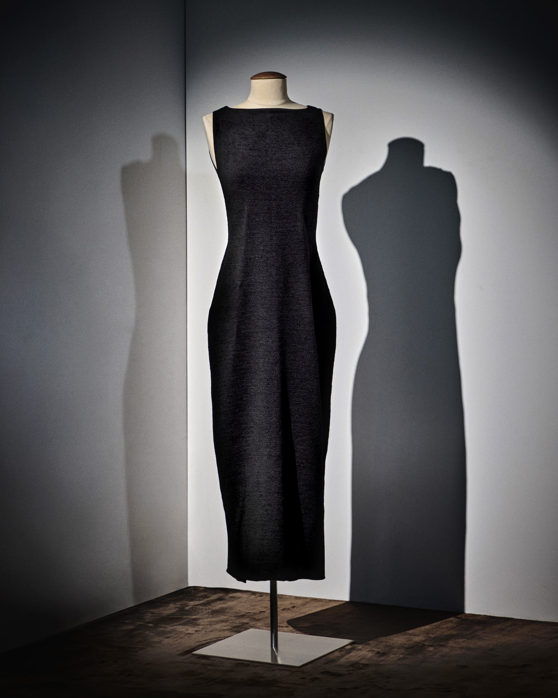 Mid-length sleeveless chenille dress with wide neckline, center back slit, and MOP button loop closure. Made in the Netherlands of Mulberry Silk.